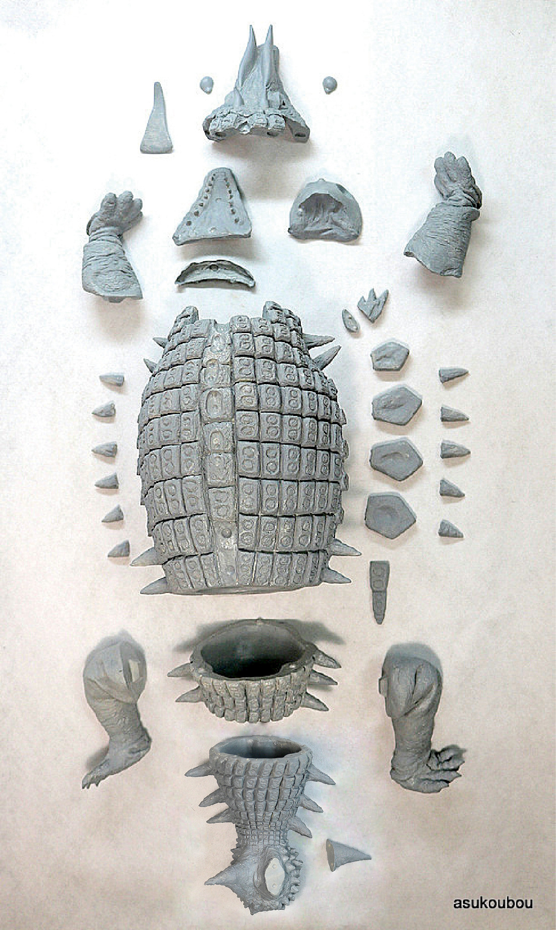 パーツ割り 全33パーツ仮(うち眼球は、透明レジン製) 胴体は中空成型。 頭部、尻尾は中空構造。 スペーサーにより開き口と少し開き口選択可能。